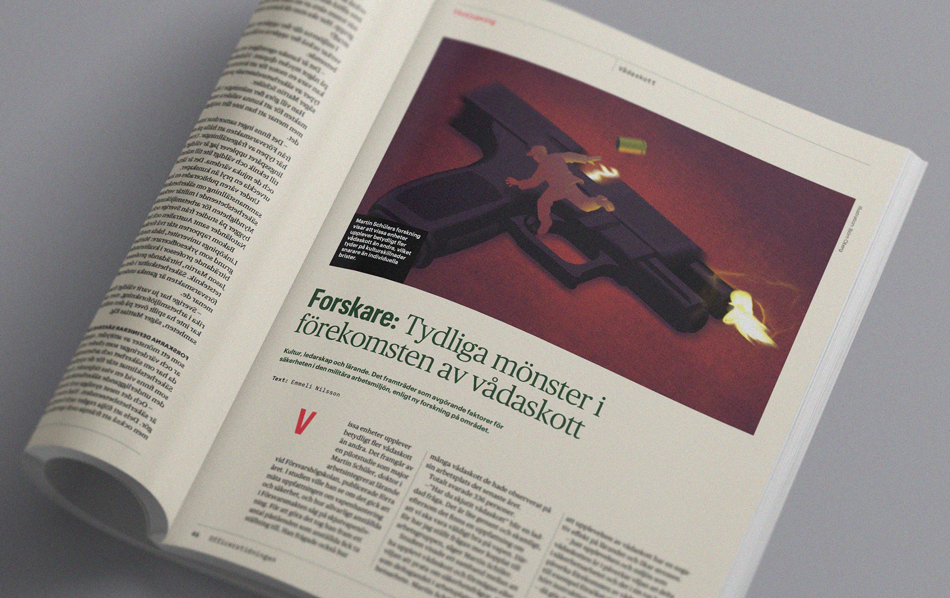 Illustrations for llustration for Officerstidningen, the magazine of the Swedish Officer’s association (the union for soldiers, sailors, officers and officer cadets). On a piece about the hazards of the accidental discharge of firearms within the military and the complex regulations surrounding follow up procedures.