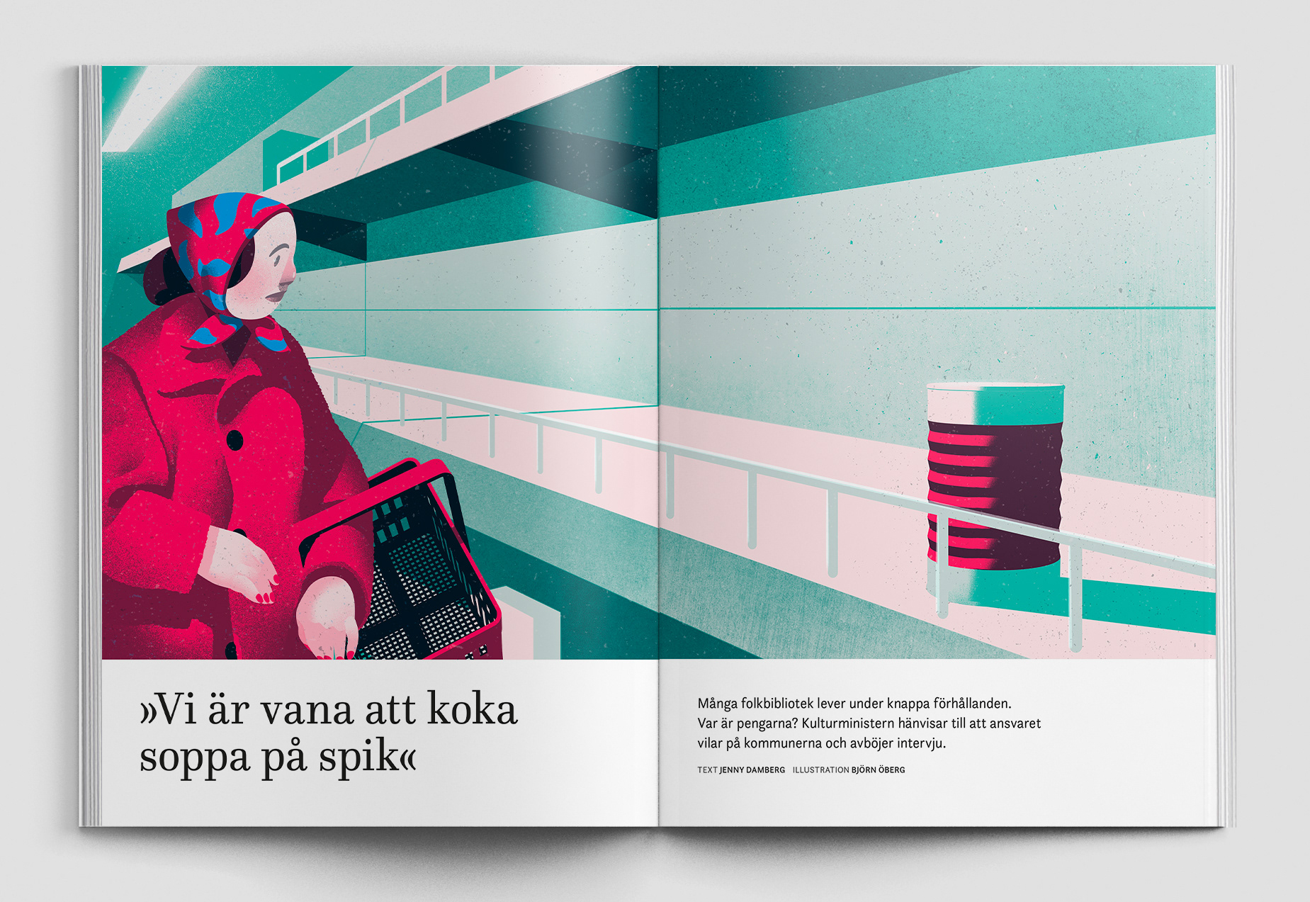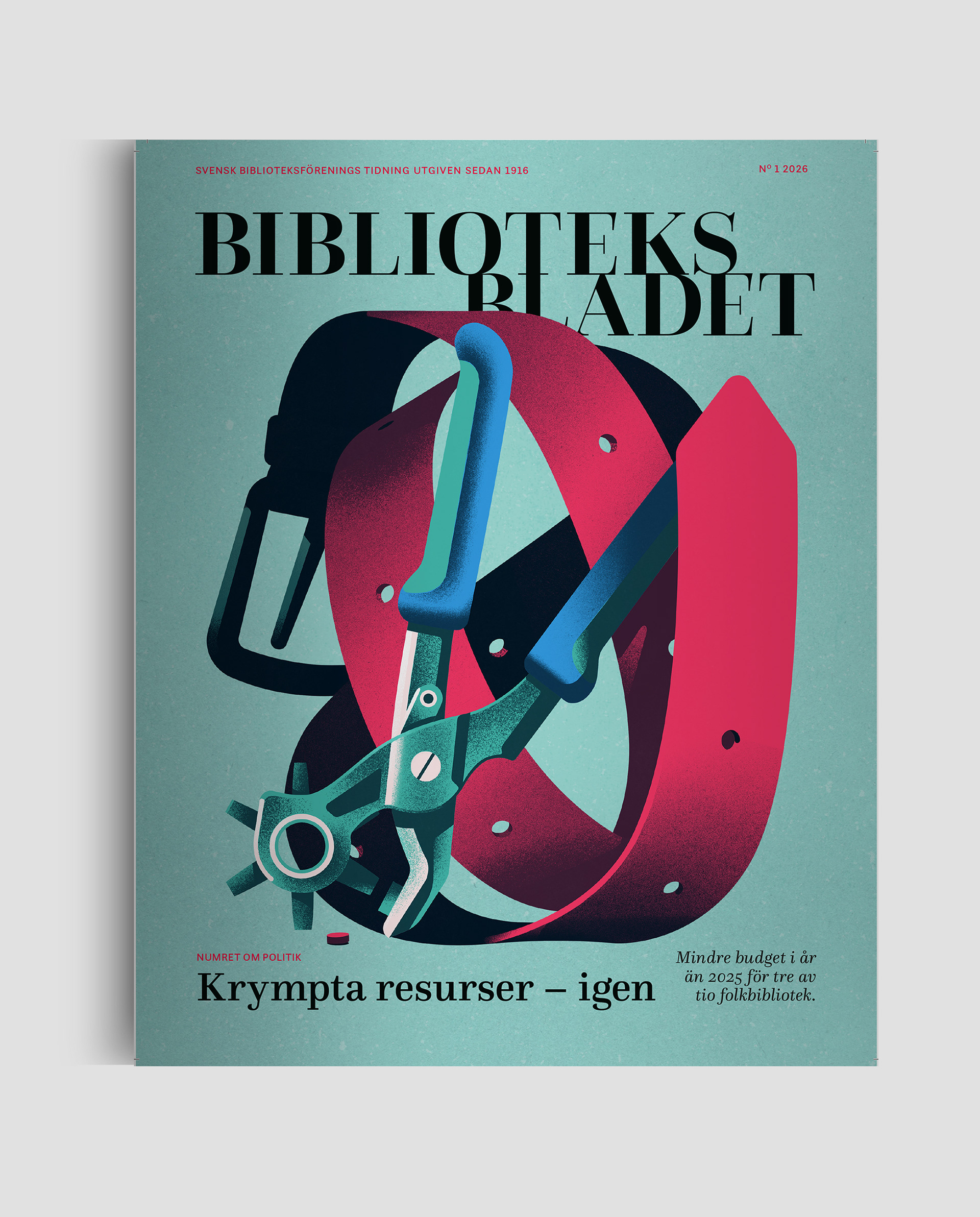 Cover and spread for Biblioteksbladet #1 2026, a magazine published by the Swedish Library Association. The article delves into how the Swedish libraries are forced to live off of "diminished resources" as government for the libraries aid grows ever scarcer.