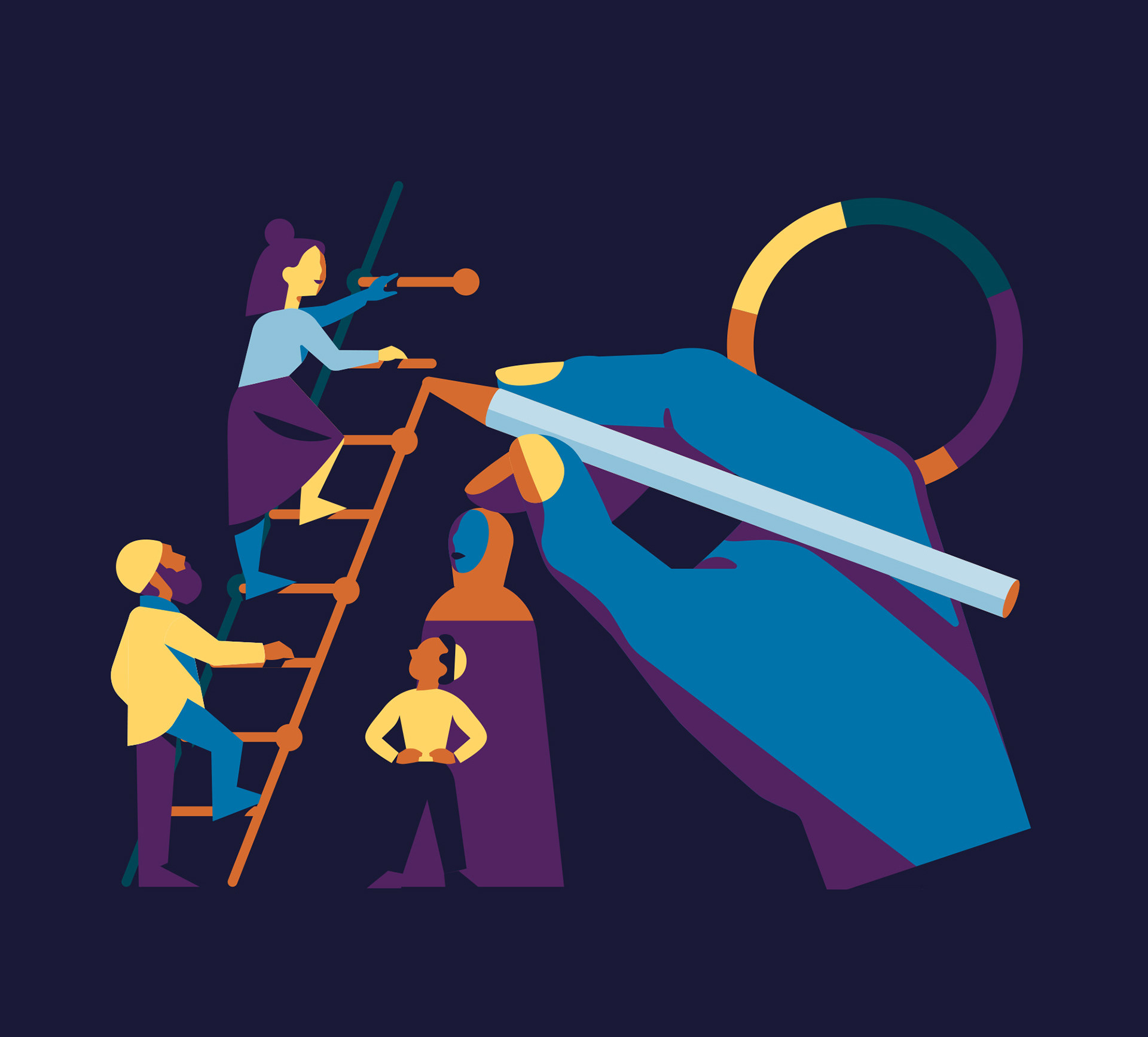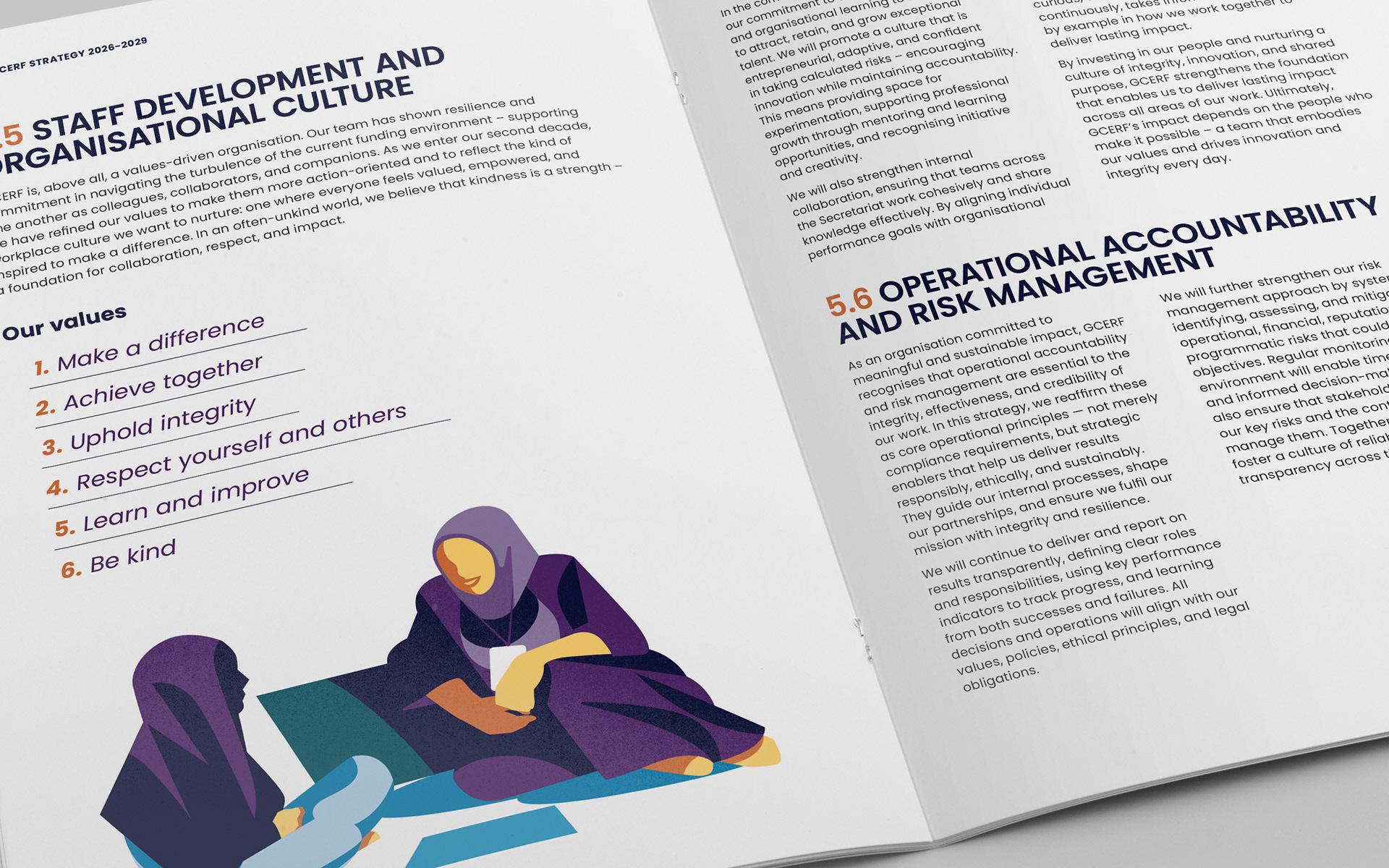 Cover and spot illustration for Global Community Engagement and Resilience Fund (GCERF) Strategy report 2026-2029. Graphic production/ Art direction by we2.co