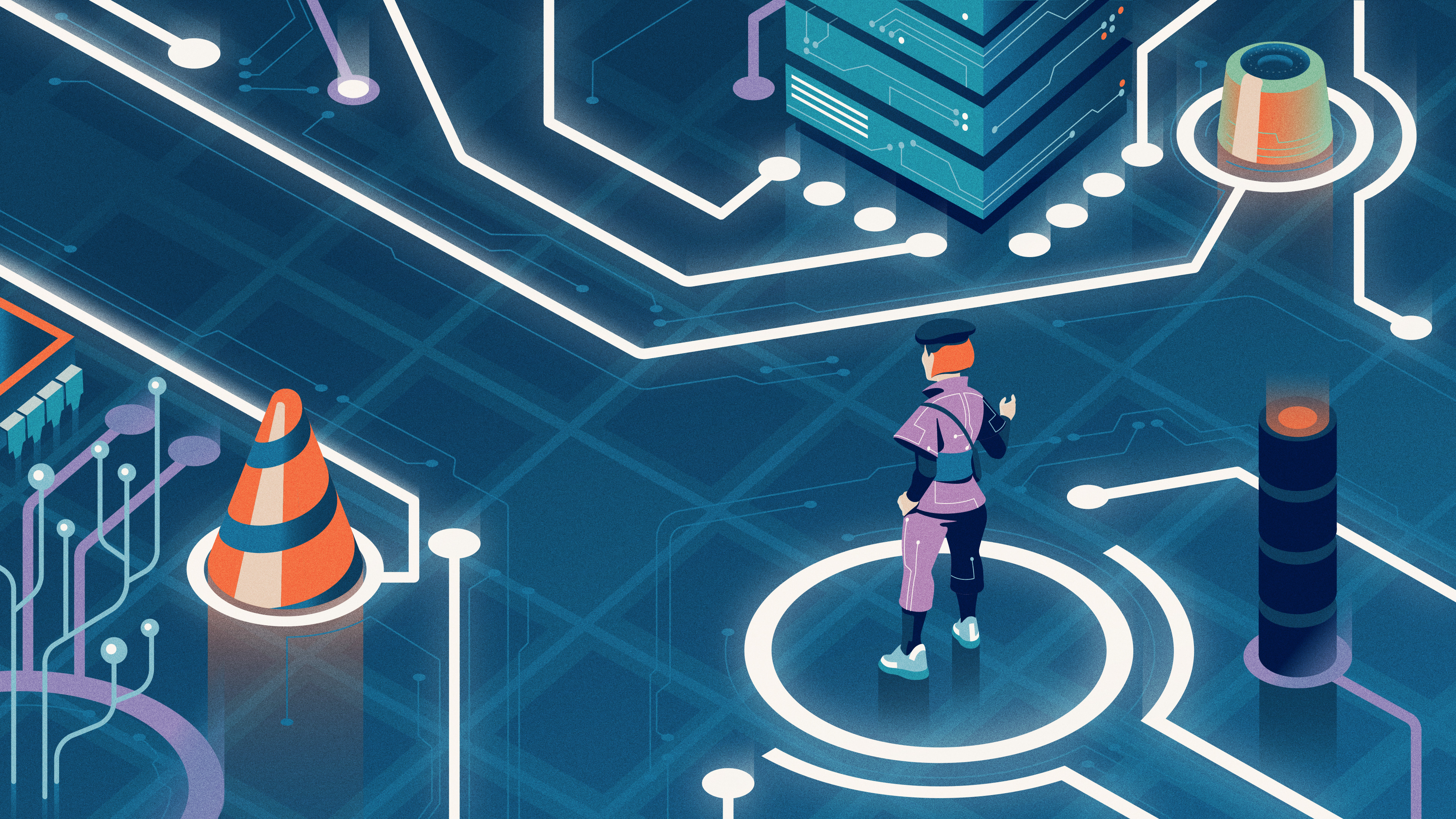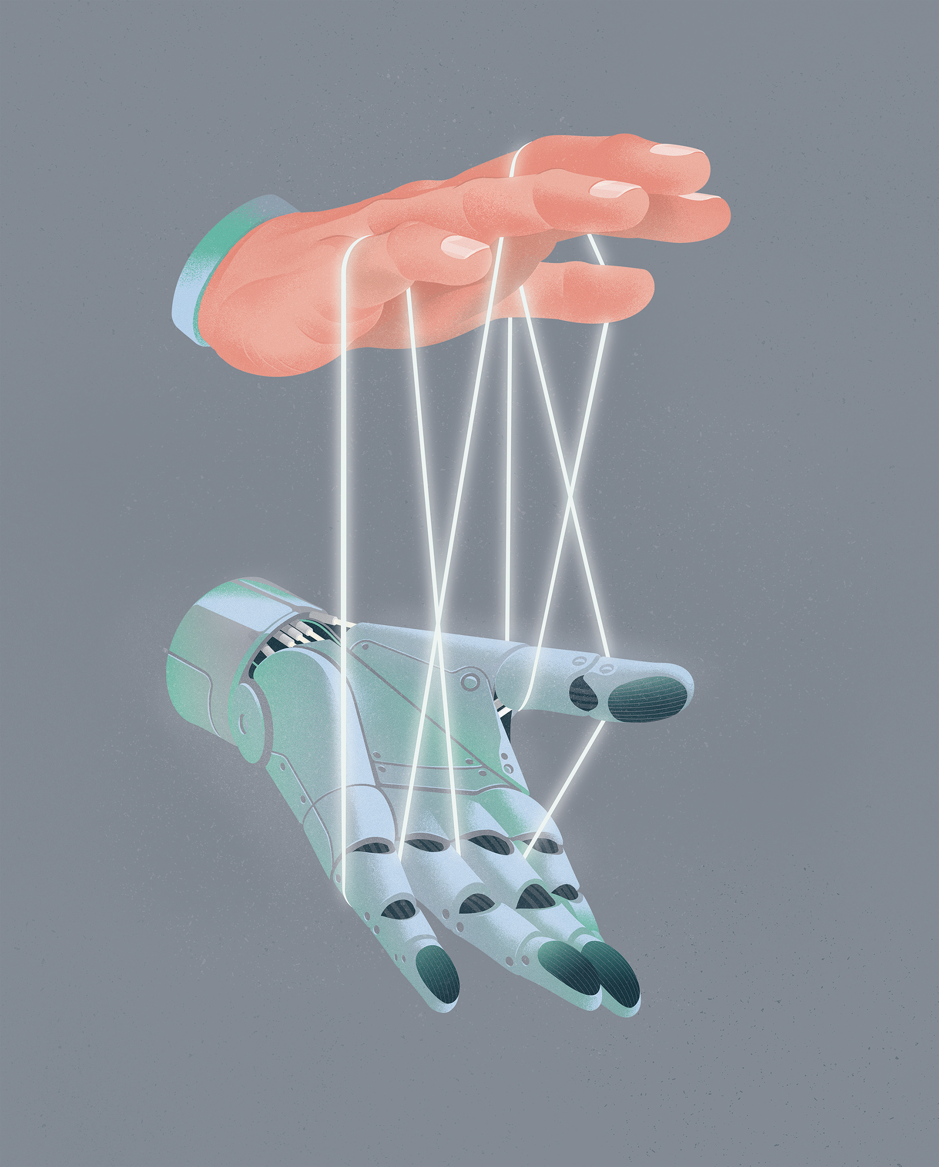illustration for a feature about the designer’s new role in an AI-driven workflow: less manual production, more direction, judgment, and responsibility.