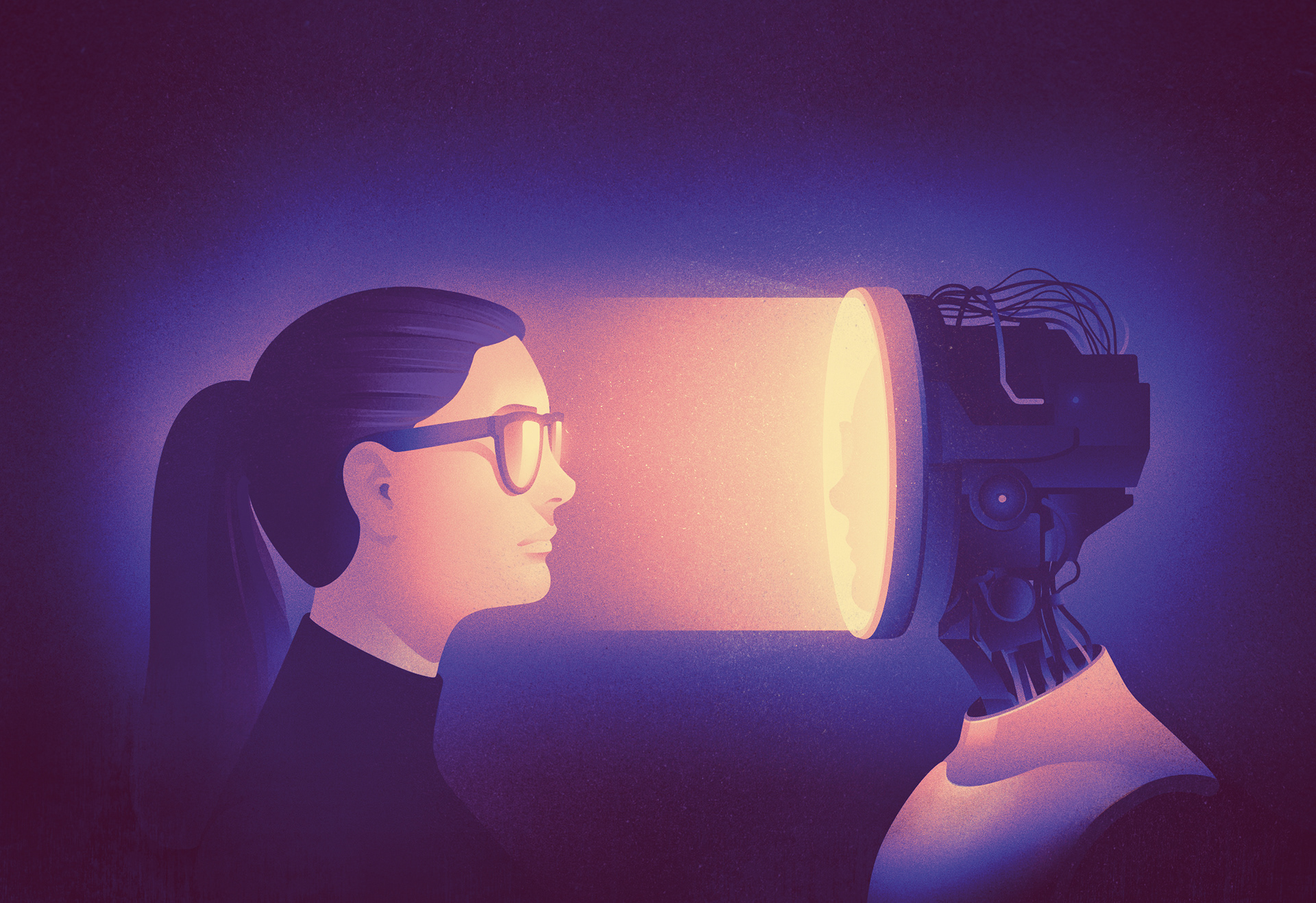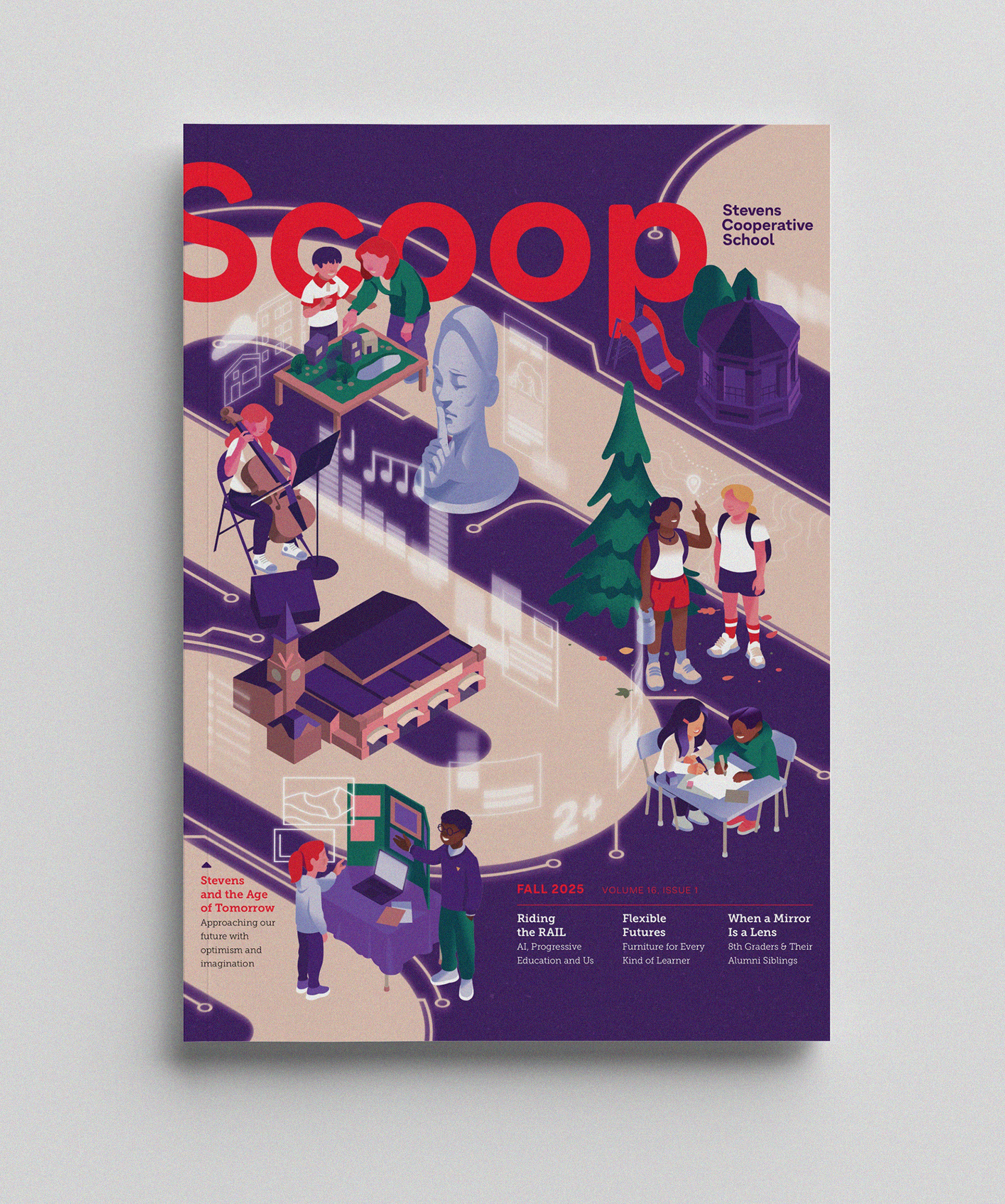 Cover illustration for Scoop Magazine (published by Stevens Cooperative School, an independent elementary and middle school just outside of NYC) The theme focuses on AI in the Stevens Cooperative School community, with an emphasis on
