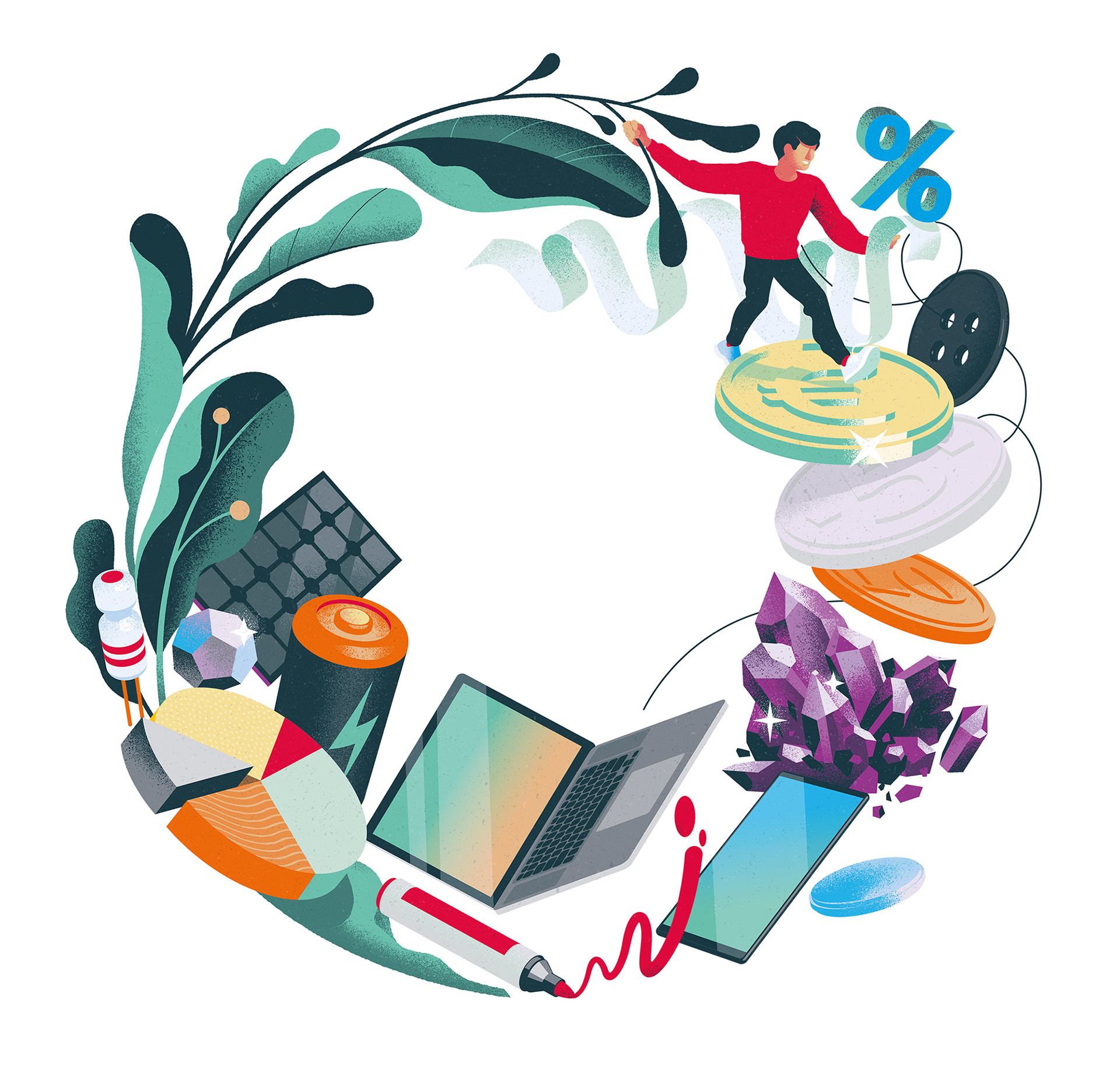 Illustrations for an article on how the mining industry can actively work towards closing the mineral loop.