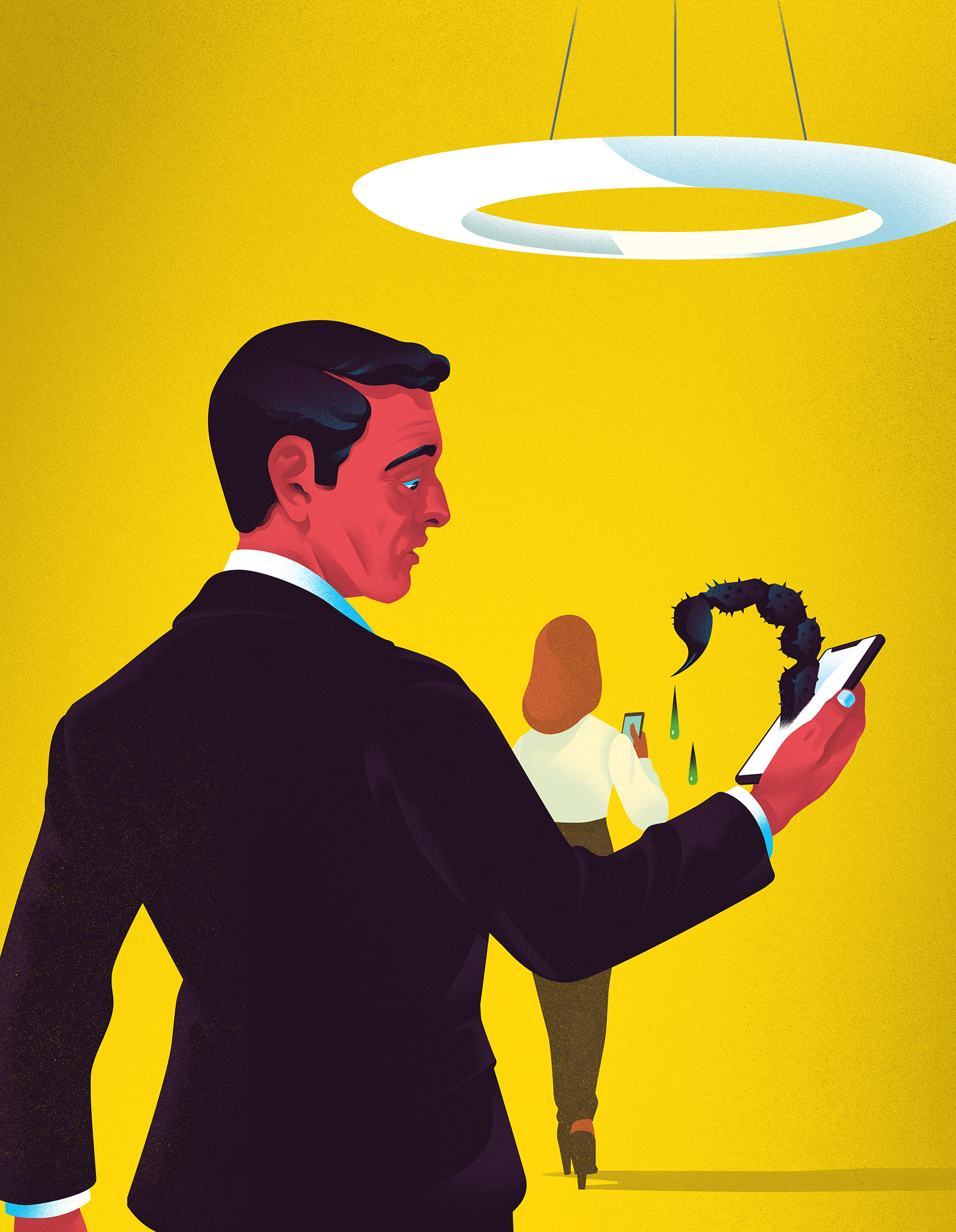 Online harassment/ bullying in the workplace; Editorial illustration for Chefstidningen - a magazine about modern leadership published by Akademikerförbundet.